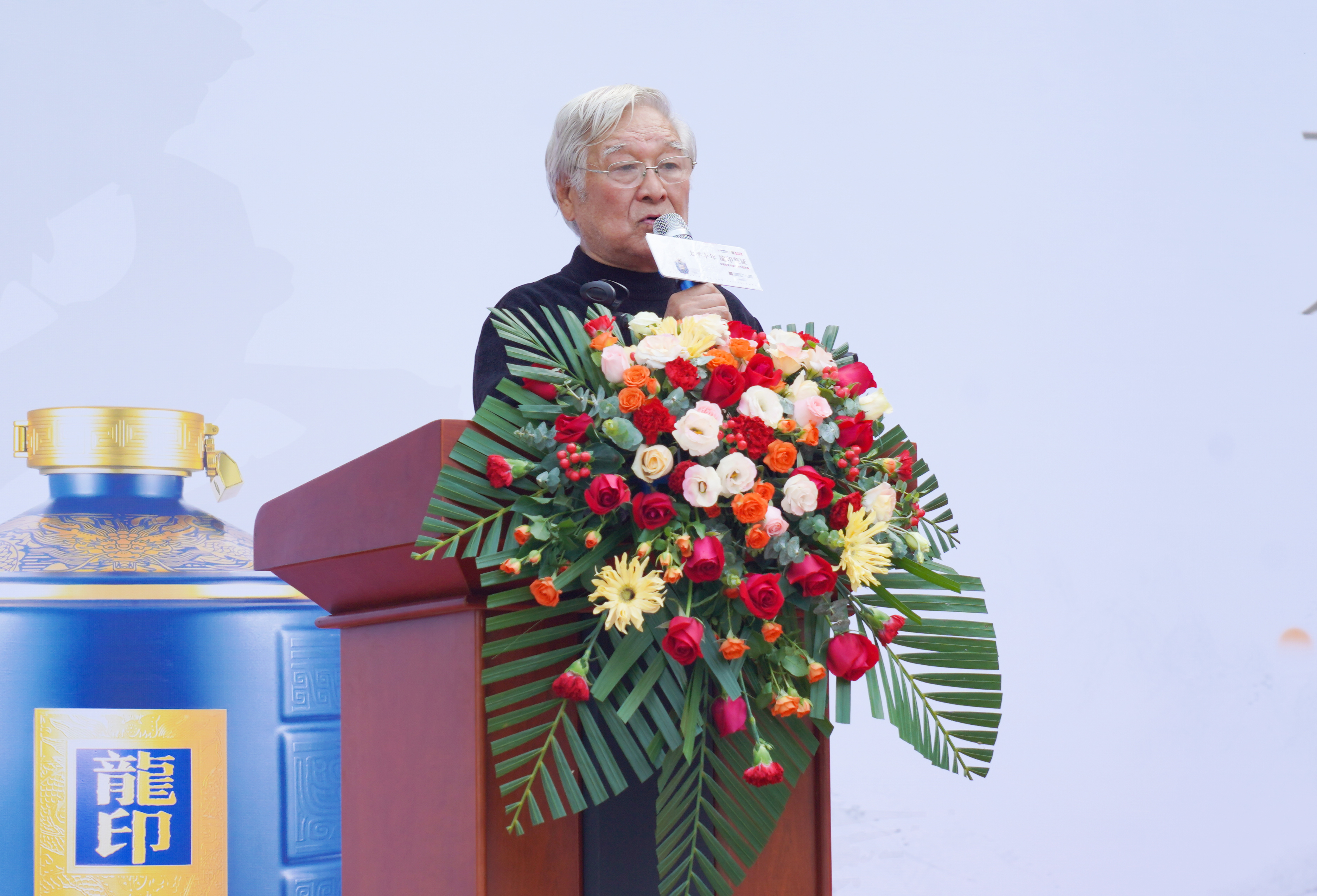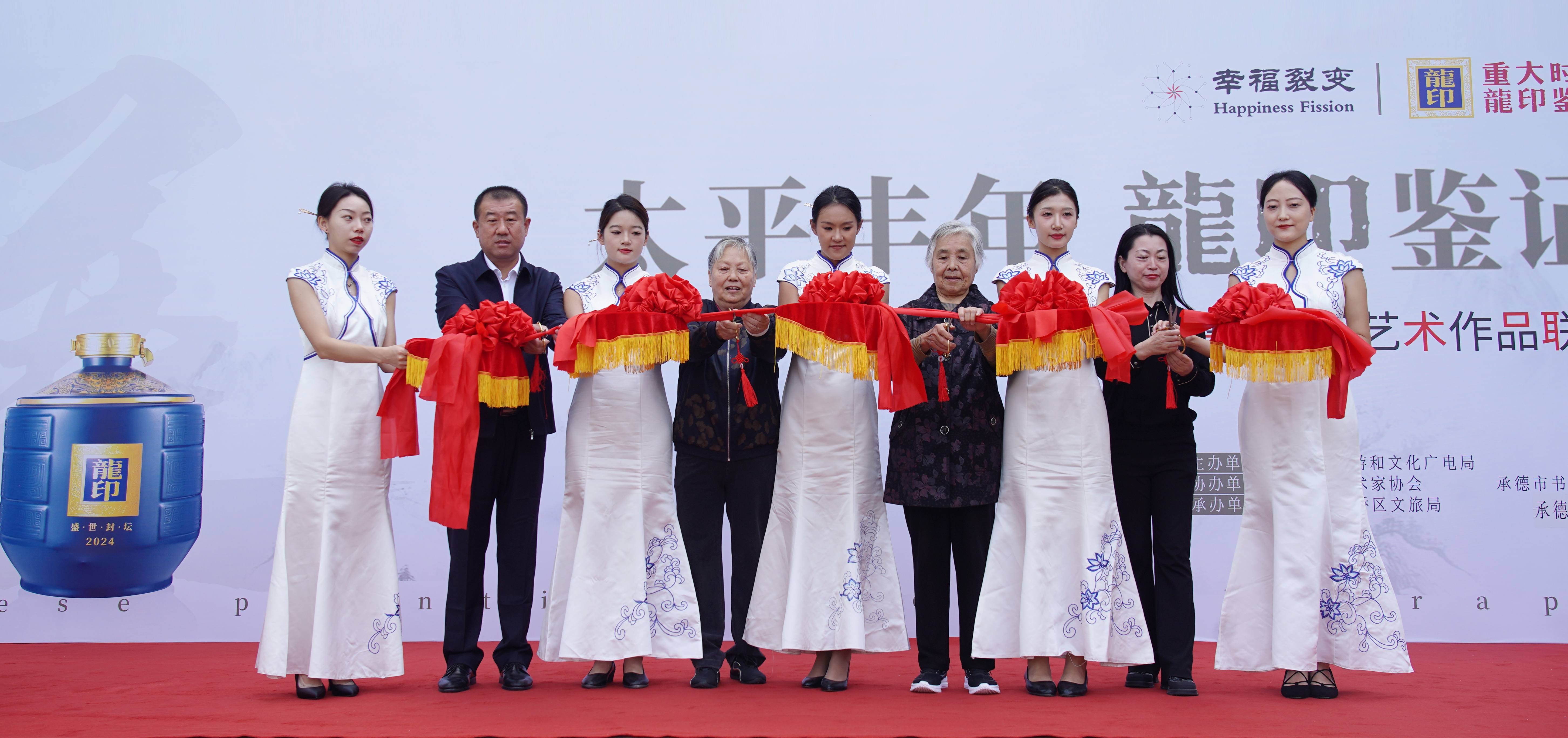 活動中,由板城酒業(yè)黨委書記、總經理張春生,承德縣文化館館長王志偉,與老一代藝術家代表王培文、毛景蘭,一同登臺,共同為“幸福裂變書畫藝術作品聯展活動”剪彩。