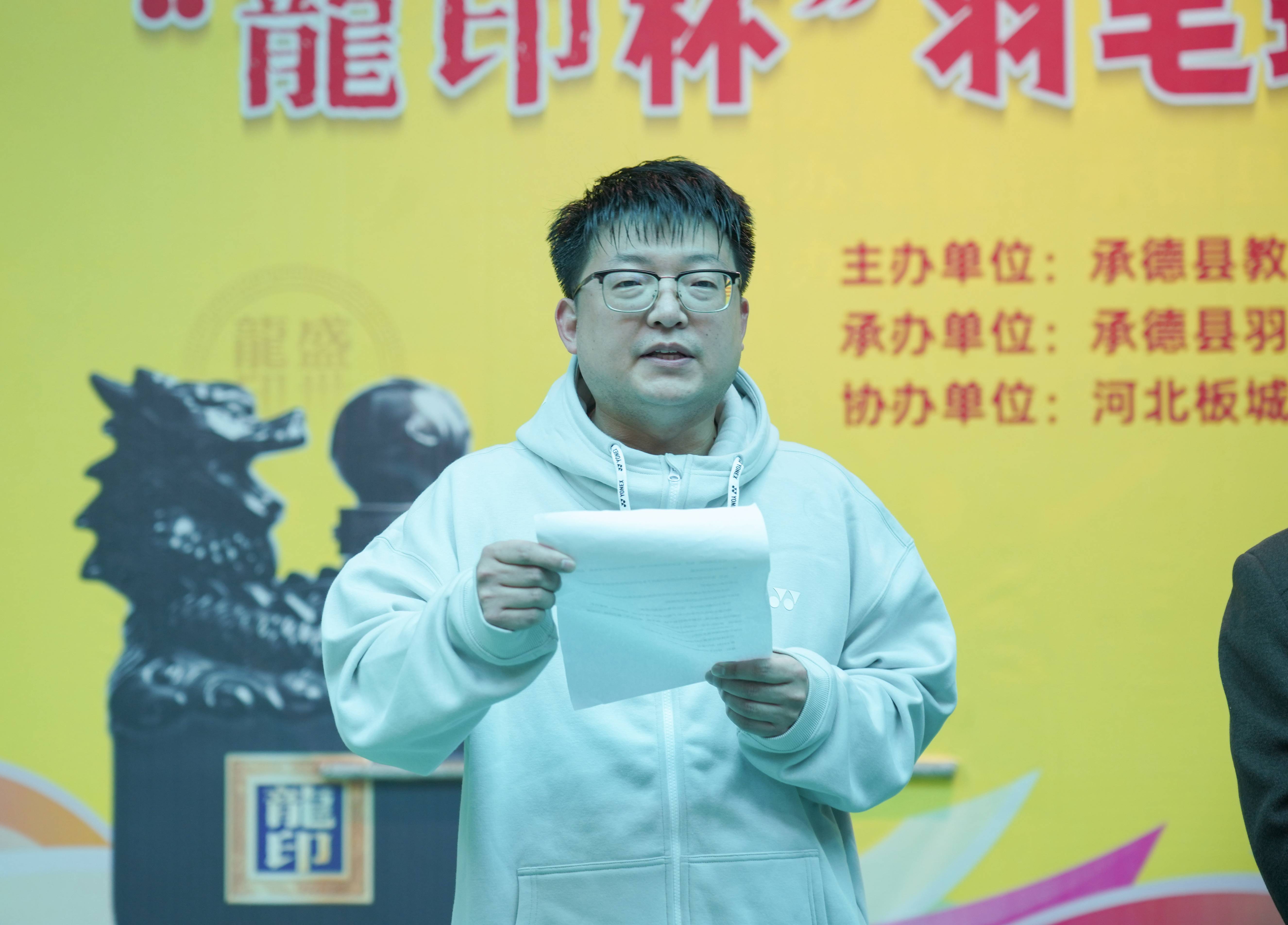 承德縣教育和體育局黨組成員朱瑞東首先進(jìn)行致辭,他表示承德縣教育和體育局積極響應(yīng)全民健身號召,開展了形式多樣的體育活動,羽毛球是一項深受大家喜愛的運動項目,通過舉辦此次賽事,增強了大家體育意識,發(fā)揚體育精神,有效推動承德縣的體育事業(yè)發(fā)展,希望各參賽人員充分發(fā)揮“團(tuán)結(jié)友愛,奮勇拼搏”的精神,賽出好成績。