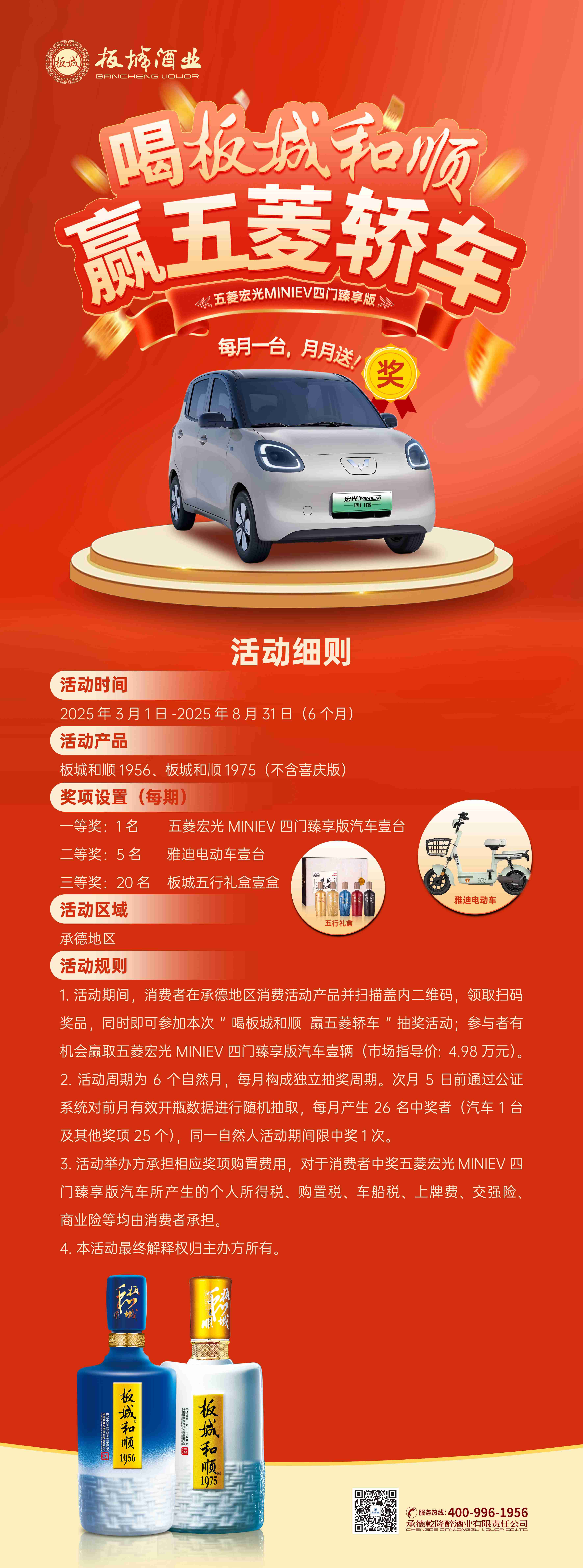 消費者在承德區(qū)域購買板城和順1975、板城和順1956(不含喜慶版)產(chǎn)品后,掃描瓶蓋內(nèi)二維碼,即可自動參與抽獎。掃碼用戶除享受原有掃碼獎勵外,還可額外獲得贏取五菱宏光MINIEV四門臻享版汽車、雅迪電動車等重磅獎品的機(jī)會。