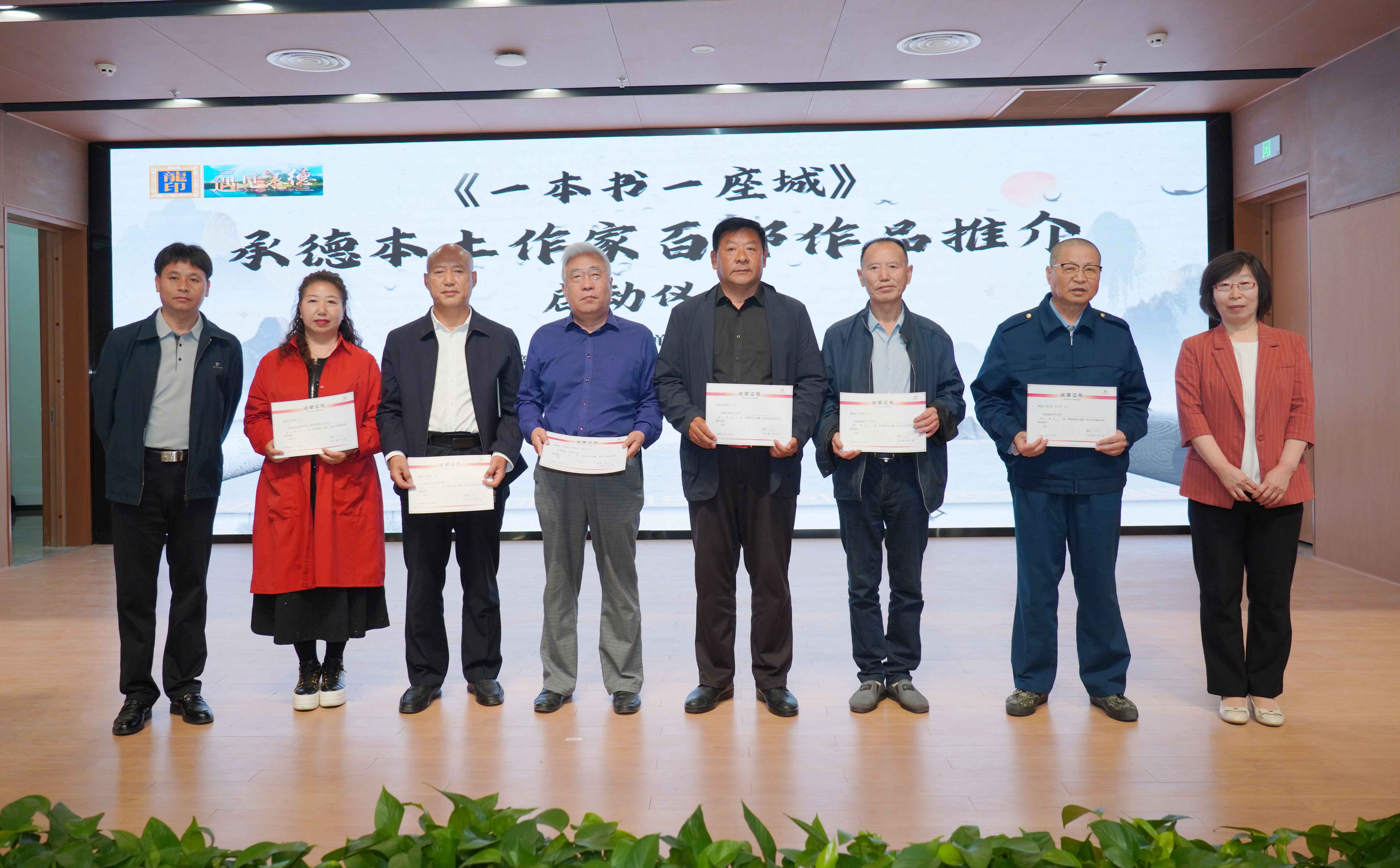 中共承德市委宣傳部三級調(diào)研員張穎和承德廣播電視臺總編輯楊潤忠為作家老師頒發(fā)收藏證書。