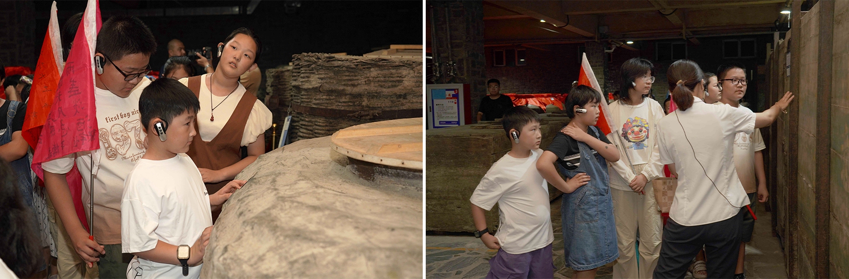 研學(xué)首站來到彌漫著酒曲氣息的慶元亨酒坊,孩子們近距離觀察窖池群落,聆聽“國家級非物質(zhì)文化遺產(chǎn)老五甑釀酒技藝”的釀酒原理。在恒溫恒濕的乾元酒窖,近距離觀察探索酒海、酒簍、陶壇交替儲存的奧秘,他們化身小小觀察員,分組協(xié)作,細(xì)致追蹤,在實踐記錄中深刻領(lǐng)悟糧食的珍貴與匠心。