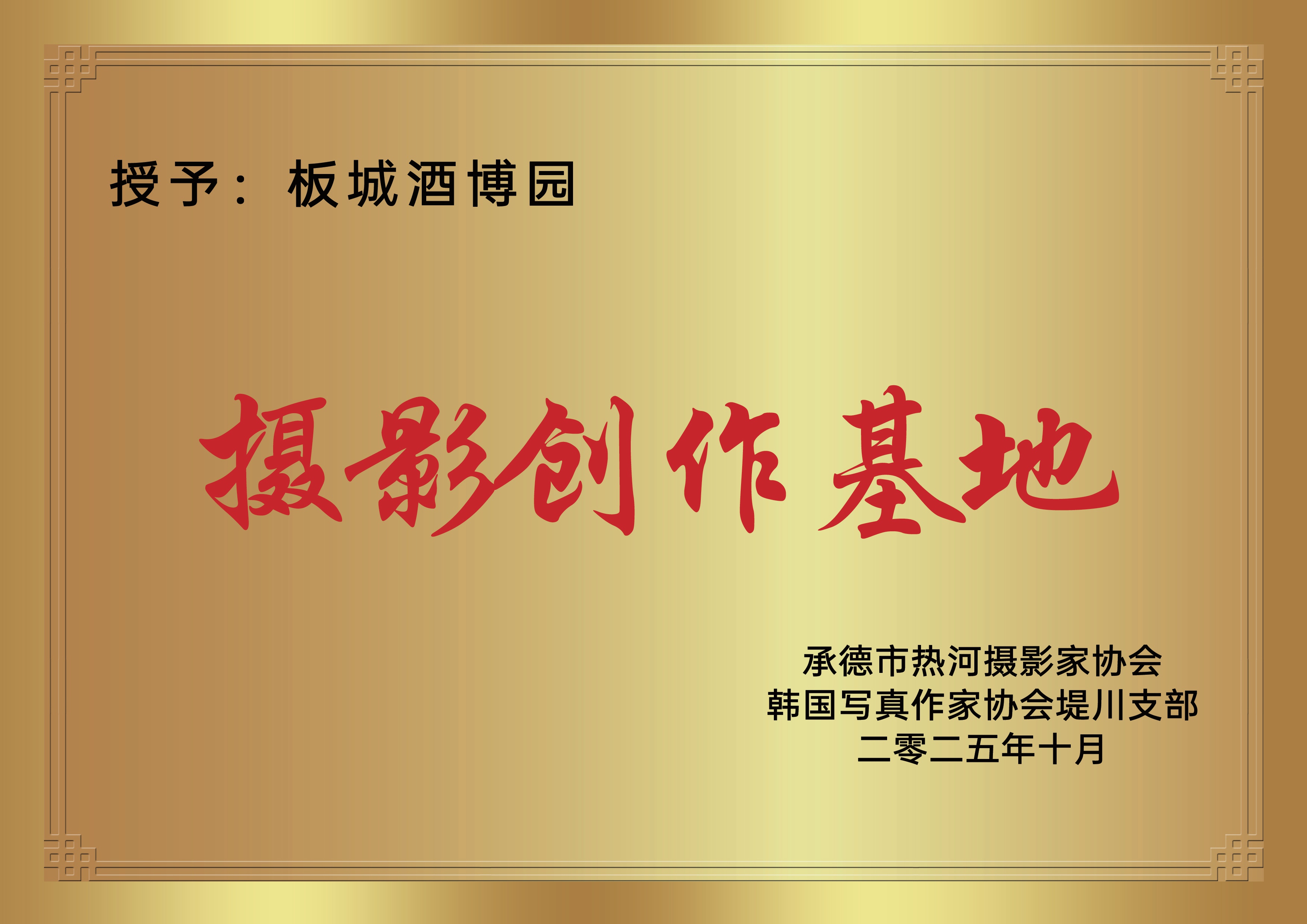 活動現(xiàn)場由河北省攝影家協(xié)會副主席、市文聯(lián)名譽(yù)主席衣志堅(jiān),承德熱河攝影家協(xié)會主席楊利民與韓國寫真協(xié)會堤川支部長金序潤共同授予板城酒業(yè)“板城酒博園攝影創(chuàng)作基地”的殊榮。