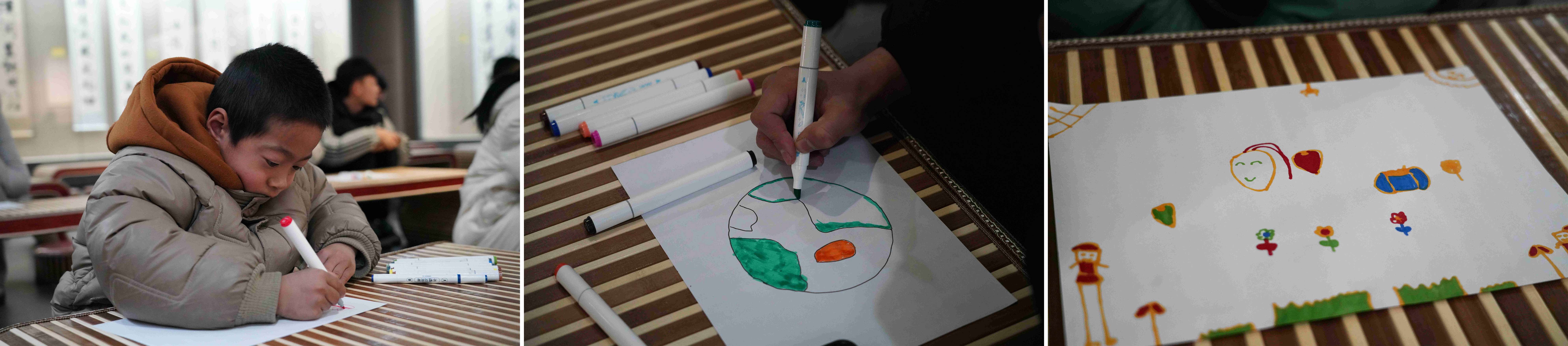 兒童組“我的快樂星球”藝術創(chuàng)作:在一個布置著字畫與小桌椅的溫馨展廳里,孩子們在專業(yè)引導下,拿起畫筆,通過色彩與線條自由表達情緒,描繪出各自獨一無二的“快樂星球”。童真的畫作,成為他們內(nèi)心世界的生動寫照。